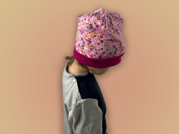 Supersüße rosa Herbstmütze mit Blumenmuster und pinkem Bündchen. Die Mütze ist perfekt für den Übergang zum Winter, da sie nicht allzu dick ist.